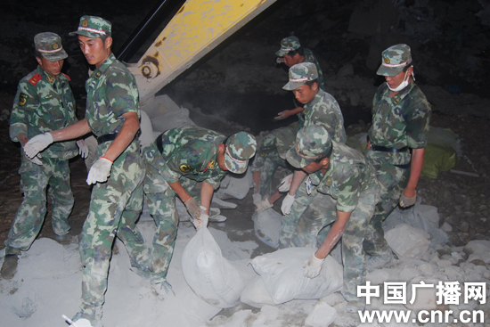 中廣網(wǎng)舟曲8月28 日消息(記者郭海涌  通訊員盧士勇 彭一桐 曹光林)8月28日,舟曲救災一線(xiàn),在圓滿(mǎn)完成搜救轉移被困群眾、生命線(xiàn)搶通、危房拆除、羅家裕導流明渠開(kāi)挖等急難險重任務(wù)后,作為國家應急救援力量專(zhuān)業(yè)隊,武警交通部直屬工程部第二工程處的90名官兵的 30臺大型專(zhuān)業(yè)救援裝備,又緊急投入到白龍江疏浚的重要工程中,和武警水電部隊、武警甘肅總隊、武警森林總隊合力打響白龍江疏浚的攻堅戰斗。被舟曲軍民譽(yù)為“專(zhuān)打硬仗的救援鐵軍”