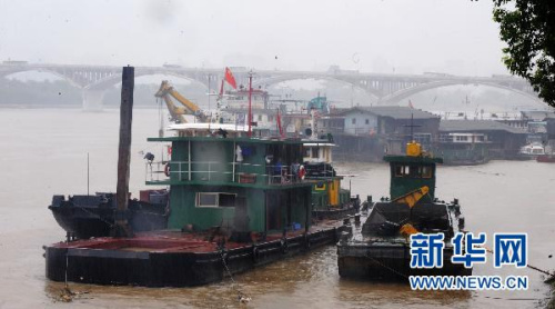 大雨中長(cháng)沙湘江邊停泊的船只(6月17日攝)。
