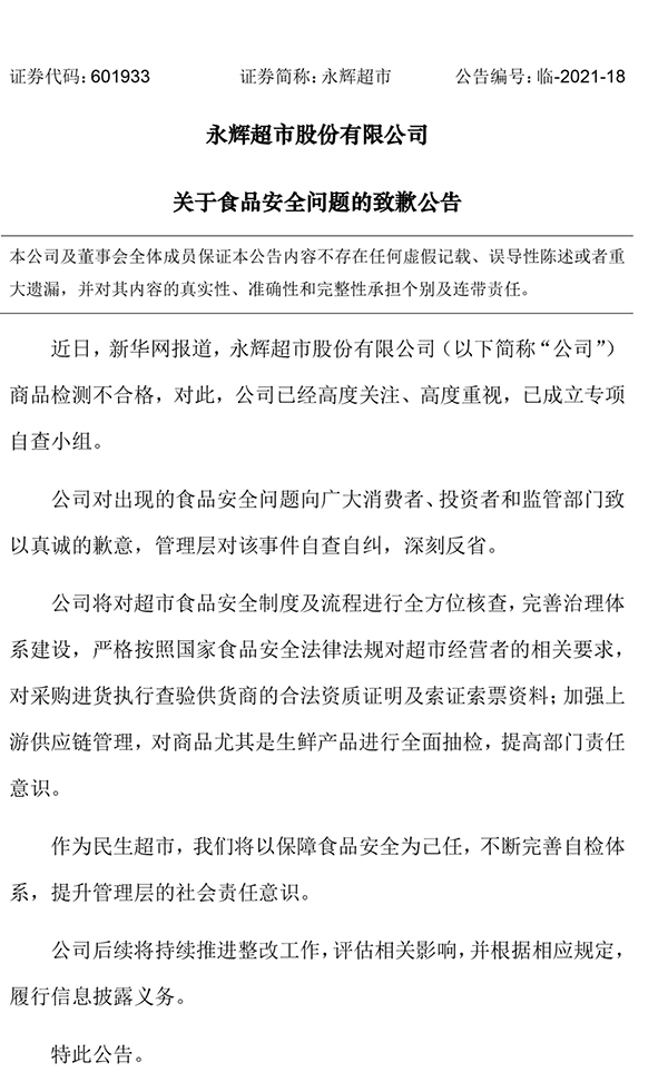 4月16日,永輝超市發(fā)布關(guān)于食品安全問(wèn)題的致歉公告:公司對出現的食品安全問(wèn)題向廣大消費者、投資者和監管部門(mén)致以真誠的歉意,管理層對該事件自查自糾,深刻反省。