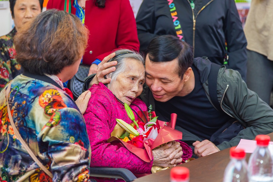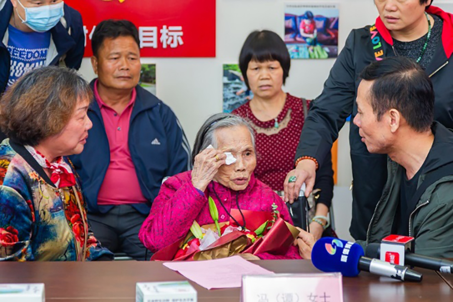 馮鳳英與親人相認,現場(chǎng)多次擦拭淚水。(央廣網(wǎng)發(fā) 通訊員 林安迪 攝)