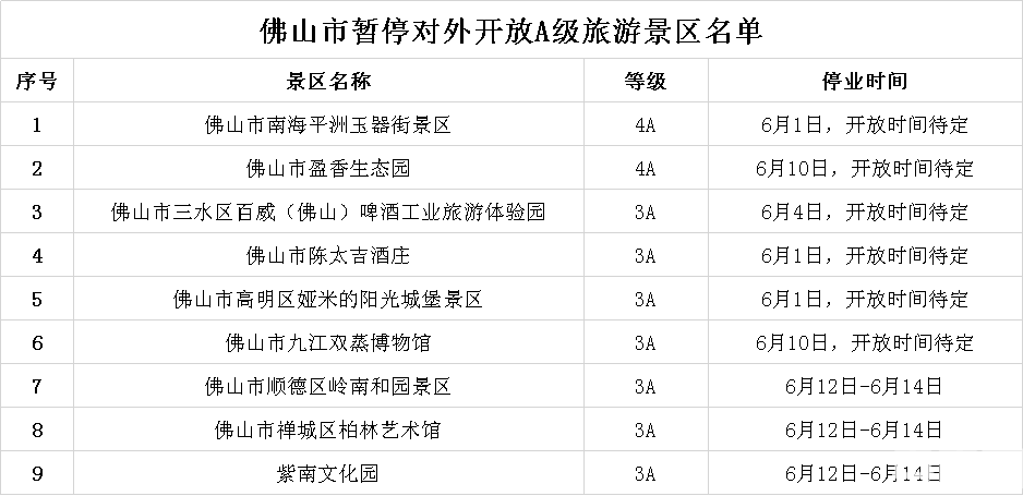 央廣網(wǎng)佛山6月11日消息(記者 張勝強、通訊員 佛宣)端午假期臨近,佛山市文化廣電旅游體育局發(fā)布《關(guān)于做好2021年“端午”假期疫情防控和安全工作的通知》(以下簡(jiǎn)稱(chēng)“通知”)。受疫情影響,全市9家A級景區暫停開(kāi)放,重新開(kāi)放時(shí)間待定。