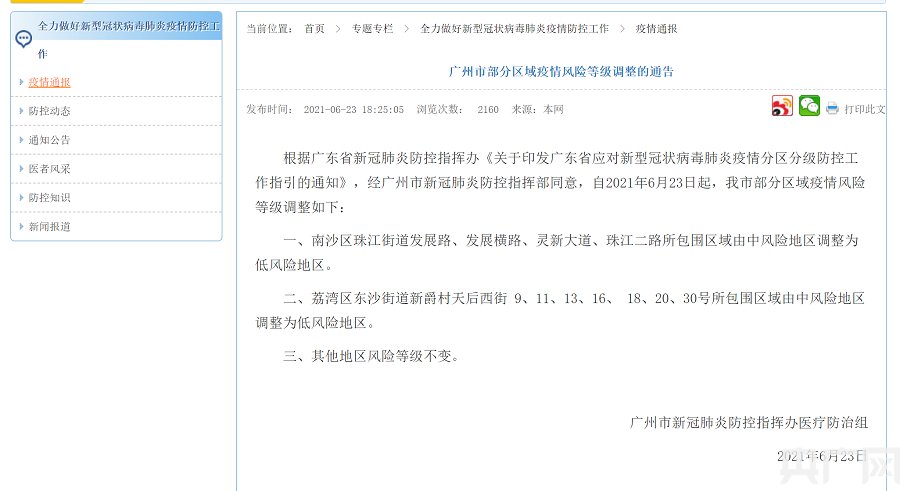 央廣網(wǎng)廣州6月23日消息(記者 張勝強)6月23日晚,記者從廣州市衛生健康委員會(huì )獲悉,自2021年6月23日起,廣州市部分區域疫情風(fēng)險等級調整如下: