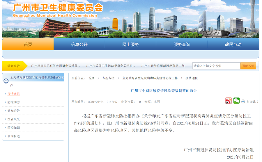 央廣網(wǎng)廣州6月24日消息(記者 張勝強)6月24日,記者從廣州市衛生健康委員會(huì )官網(wǎng)獲悉,自2021年6月24日起,廣州荔灣區白鶴洞街由高風(fēng)險地區調整為中風(fēng)險地區。其他地區風(fēng)險等級不變。