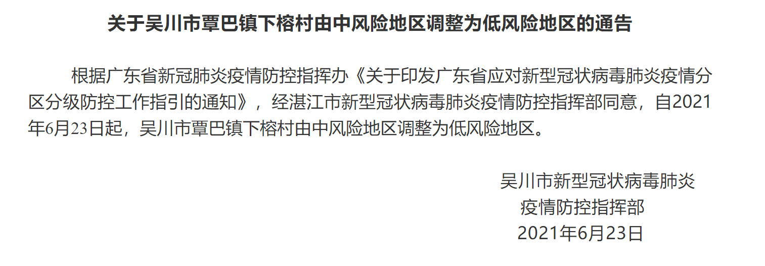 6月6日,吳川出現一例本土新冠病例。疫情發(fā)生后,湛江市新冠肺炎疫情防控指揮部立即啟動(dòng)應急預案,迅速開(kāi)展處置和流調溯源工作,排查密切接觸者,將患者轉運至定點(diǎn)救治醫院治療。同時(shí),部署進(jìn)行吳川市大規模核酸檢測,多次檢測全部陰性。湛江全市上下眾志成城、守望相助,確保了各項防控措施有力有效落實(shí)。
