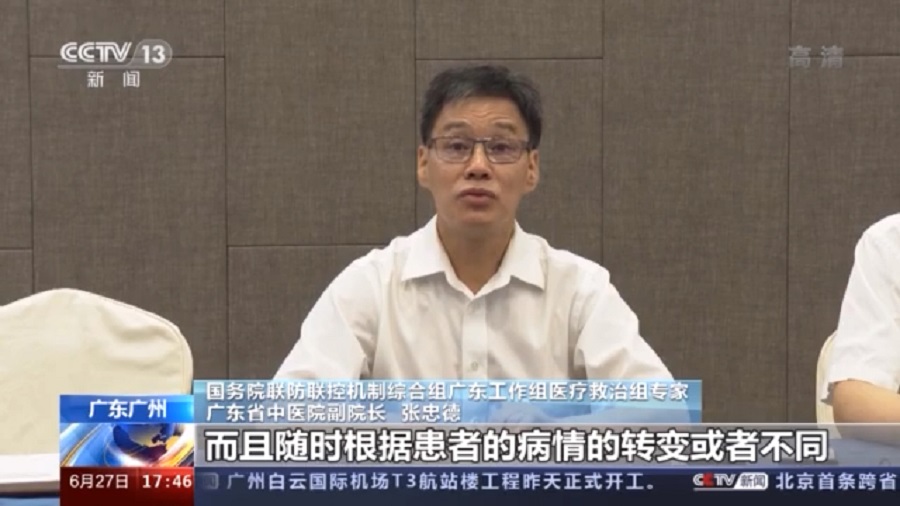國務(wù)院聯(lián)防聯(lián)控機制綜合組廣東工作組醫療救治組專(zhuān)家、廣東省中醫院副院長(cháng) 張忠德:在危重癥跟重癥患者中,我們始終堅持現代醫學(xué)的一些救治手段,呼吸機,ECMO,心電監測,氣管鏡這些治療的同時(shí),用中醫藥排毒,我們對每一個(gè)重病人跟危重病人都采用了一些中西醫協(xié)同治療方法,而且隨時(shí)根據患者的病情的轉變或者不同,隨時(shí)進(jìn)行調整,才取得現在這樣階段性的重大成果。