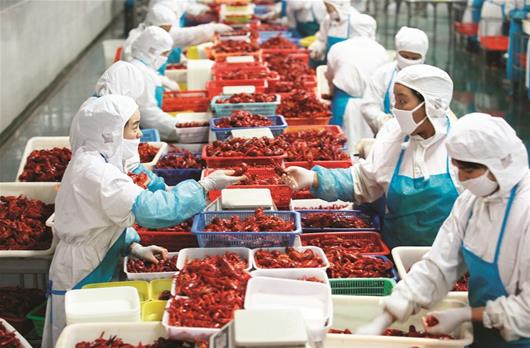 湖北日報訊 圖為:潛江小龍蝦加工現場(chǎng)
