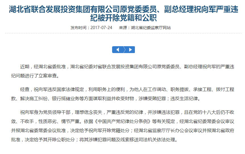 湖北省聯(lián)合發(fā)展投資集團有限公司原黨委委員、副總經(jīng)理祝向軍嚴重違紀被開(kāi)除黨籍和公職