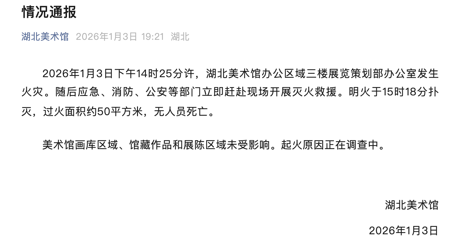 2026年1月3日下午14時(shí)25分許,湖北美術(shù)館辦公區域三樓展覽策劃部辦公室發(fā)生火災。隨后應急、消防、公安等部門(mén)立即趕赴現場(chǎng)開(kāi)展滅火救援。明火于15時(shí)18分撲滅,過(guò)火面積約50平方米,無(wú)人員死亡。