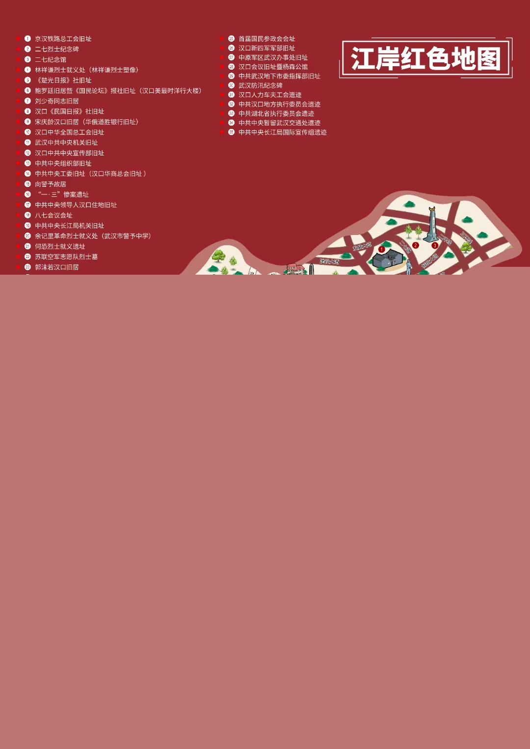 歷史是最好的教科書(shū)。該區將轄區內35處紅色點(diǎn)位進(jìn)行梳理,經(jīng)實(shí)地走訪(fǎng)、查閱史料、專(zhuān)家論證,繪制出《江岸紅色地圖》。這份地圖包含重要革命遺址遺跡、舊址及紀念設施,涵蓋了國家級、省級、市級文物保護單位。