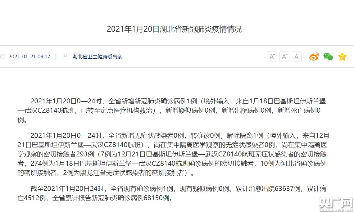 2021年1月20日0—24時(shí),湖北省新增新冠肺炎確診病例1例(境外輸入,來(lái)自1月18日巴基斯坦伊斯蘭堡—武漢CZ8140航班,已轉至定點(diǎn)醫療機構救治),新增疑似病例0例,新增出院病例0例,新增死亡病例0例。