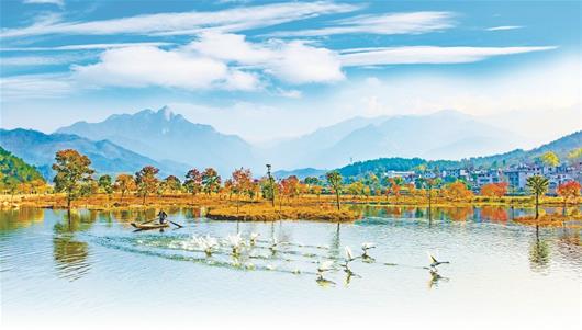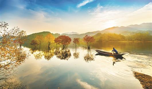 圖為:碧水藍天映秋色
