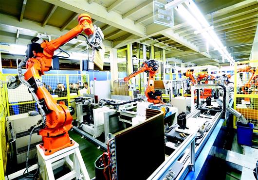 湖北日報訊 圖為美的集團武漢制冷設備有限公司智能制造生產(chǎn)線(xiàn)上的機器手臂在運行。(記者 張朋 攝)