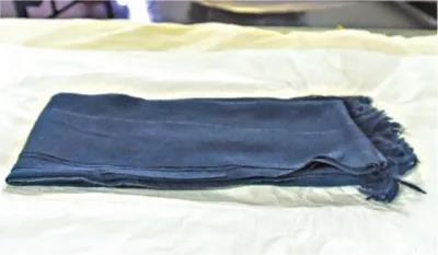 靜靜呈現在我們面前的,是一條灰色暗花絲織圍巾,長(cháng)141厘米、寬55厘米,暗花中夾雜著(zhù)五條白色絲絨,每條間隔10厘米。