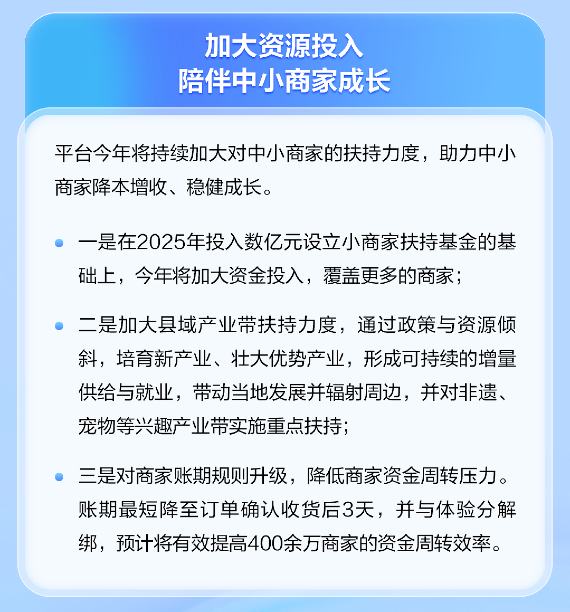 針對不同發(fā)展階段的商家,平臺提出差異化扶持安排,包括通過(guò)專(zhuān)項計劃支持品質(zhì)商家穩步發(fā)展,降低新商家入駐和起步成本,并為中小商家提供資金、流量和服務(wù)支持。同時(shí),平臺加大對縣域產(chǎn)業(yè)帶和特色產(chǎn)業(yè)的扶持力度;優(yōu)化賬期規則,賬期最短可降至訂單確認收貨后3天,以緩解商家資金周轉壓力。