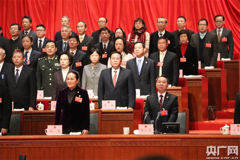 上午9時(shí),董云虎宣布大會(huì )開(kāi)幕,全體起立,奏唱國歌。