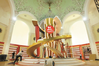 接近17時(shí)布展清場(chǎng)時(shí)間,忙碌一天的工作人員從各崗位撤離,等待次日清晨再入場(chǎng)沖刺。在貴州展區布展的幾個(gè)女孩,這才有時(shí)間好好看一眼主會(huì )場(chǎng)的建筑細節!澳沁叺鸟讽斦嫫!”順著(zhù)手指方向望去,序館淺綠色布滿(mǎn)美麗花紋的穹頂下,今年書(shū)展主造型已經(jīng)樹(shù)起,金色立柱旁是盤(pán)旋而上的階梯。很快,這里又將成為讀者們爭相留下每年書(shū)展記憶的“書(shū)香地標”。(記者施晨露)