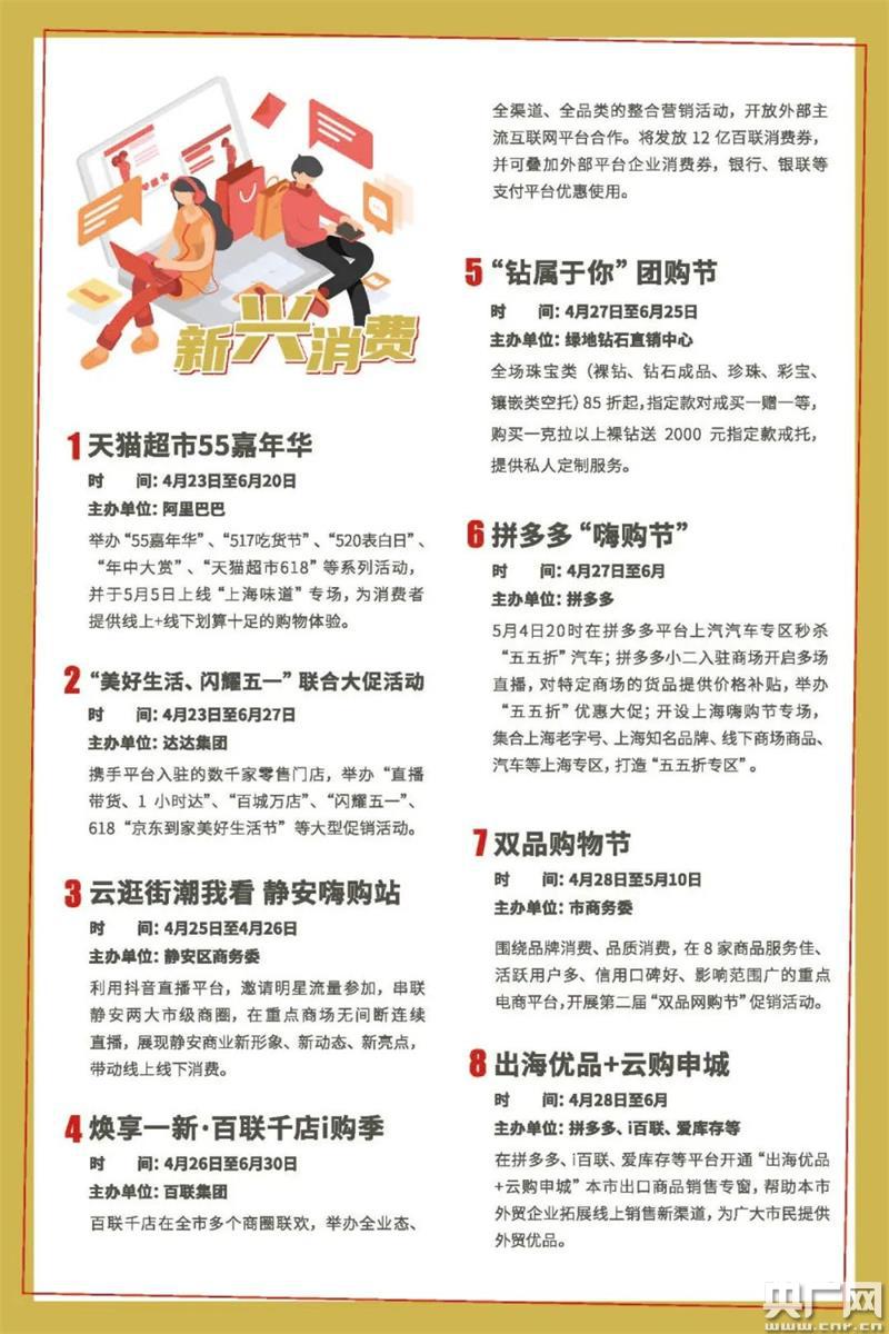 消費是經(jīng)濟增長(cháng)的第一動(dòng)力。華源介紹,為了有效地應對疫情沖擊,全力打響上!八拇笃放啤,加快建設國際消費城市,上海決定出臺《若干措施》,并舉辦“五五購物節”。