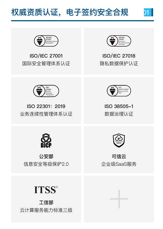 上上簽電子簽約將安全合規與標準遵從融入產(chǎn)品設計與安全運營(yíng),持續優(yōu)化整體安全能力和業(yè)務(wù)保護水平。據安全白皮書(shū)披露,至目前為止,上上簽電子簽約于行業(yè)內率先獲得ISO27001國際安全認證、ISO27018隱私數據保護認證、公安部“信息安全等級保護三級”認證、工信部“可信云服務(wù)”認證、工信部“云計算服務(wù)能力標準符合性評估三級”認證、“ISO 22301:2019業(yè)務(wù)連續性管理體系”認證,并獲得“英國B(niǎo)SI協(xié)會(huì )頒發(fā)的全球首張ISO38505-1數據治理”認證證書(shū),以七大全球權威安全資質(zhì)推動(dòng)行業(yè)安全技術(shù)門(mén)檻不斷提升。