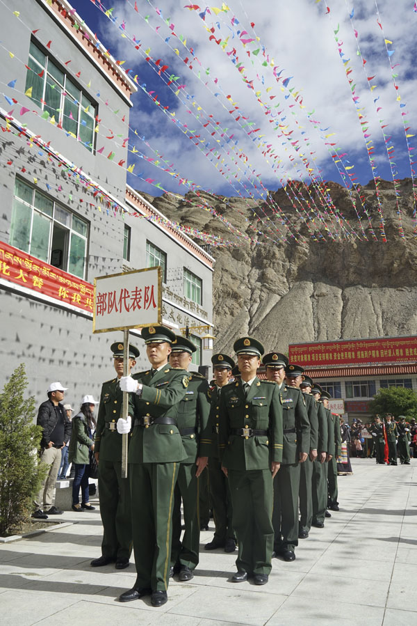 開(kāi)幕式共分為五項議程。首先,來(lái)自洛扎縣各單位的8個(gè)游行方隊,共200多人,在觀(guān)眾們的歡呼喝彩聲中依次入場(chǎng),順時(shí)針繞廣場(chǎng)一周,為開(kāi)幕式預熱。其中,當地駐軍部隊的官兵步伐整齊、英姿颯爽、口號洪亮,當地百姓無(wú)一不歡呼鼓掌,也為這些平日里擔任祖國邊防重任的人民子弟兵送去節日的祝福。另外,僧尼方隊、藏戲表演隊、退休人員方隊、學(xué)生儀仗隊等方隊也都展示了各具特色的風(fēng)采,現場(chǎng)氣氛一下子被點(diǎn)燃。
